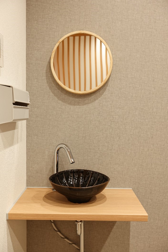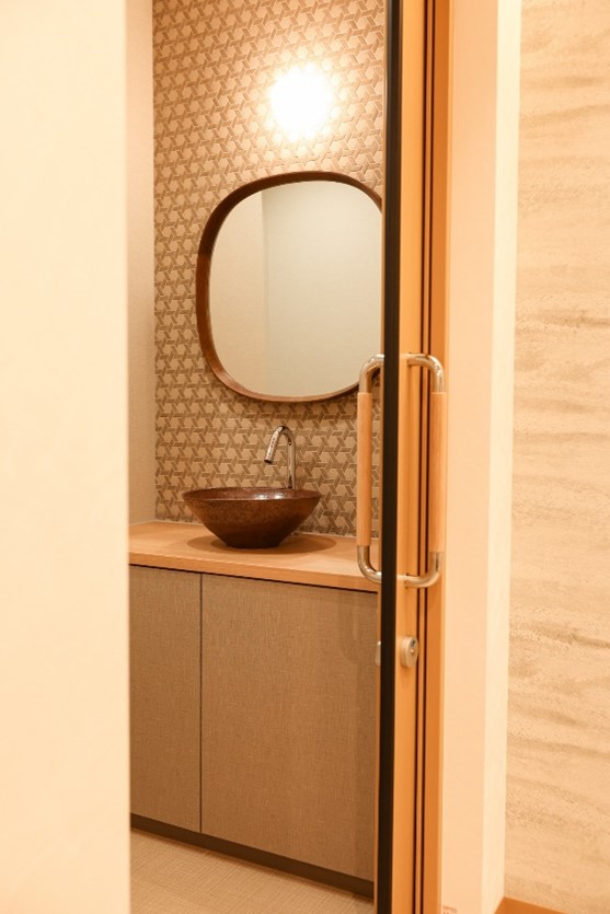 そんな中でも、益子焼の手洗い器や曲木化粧鏡、障子ランプなどを採用し、和の落ちつきを演出しています。
