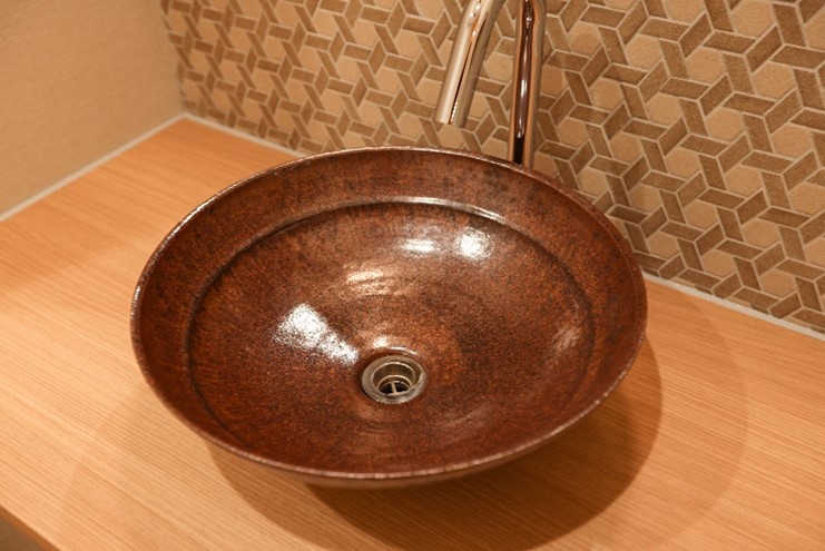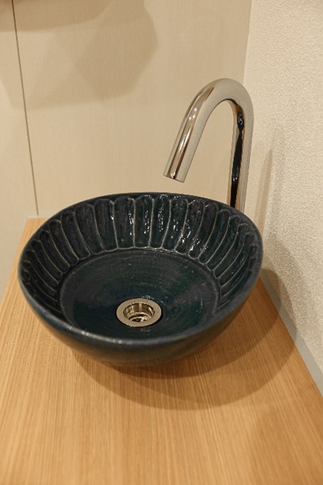 手洗器はリバビリコーナ―、採尿室共に益子焼の一点ものです。安倍先生自ら陶芸作家のアトリエにも足を運んでいただき、作り手との対話の中で温かみのある作品を選定しました。