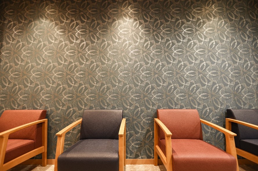 まず第一に、患者様が心を落ち着け、ゆったりした待ち時間を過ごせるように落ちついた内装材をコーディネートしました。アクセントの壁紙は、青緑の幾何学柄で、インテリア全般の統一感を出しました。椅子やソファはシンプルに自由に配置換えできる使い勝手がよく、座りやすいのものを。張地も和調で肌触りが良く、清掃時にも薬品に強い素材を採用しています。