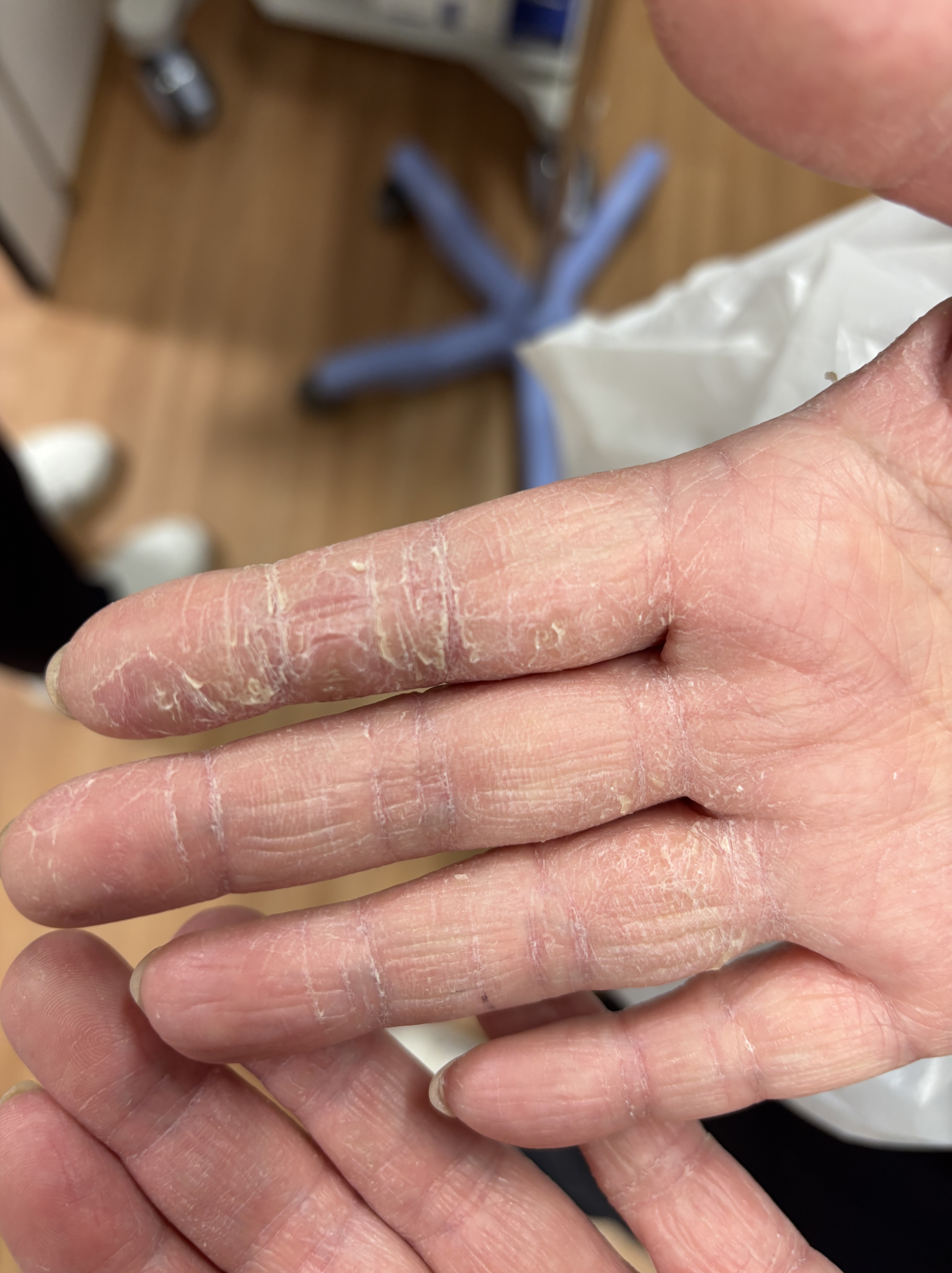 10月31日、塗布から4日後、裂けていた皮膚の修復が進み、ひび割れや赤みが著明に改善しました。まだ完全ではありませんが、手洗いでの沁みる症状は解消されました。
