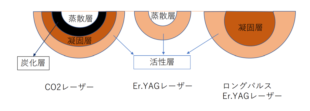 Fotona社のSmooth modeのロングパルスEr.YAGレーザーは非焼灼式(焦げない、蒸散層がない)低侵襲レーザーで組織の弱い方に適したレーザーと考えられます。蒸散層や炭化層は若い組織であれば治癒力も高く、回復は問題ないのですが、組織が弱い方にはより低侵襲なレーザーを用いることで、レーザー照射後の症状が軽減されます。