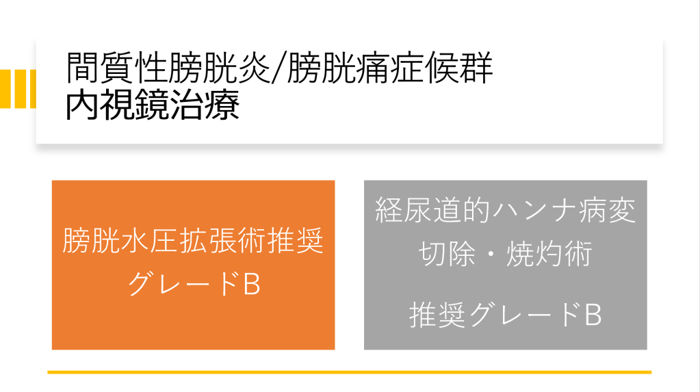 - 国内では「膀胱水圧拡張術+DMSO膀胱内注入」が保険適用となっており、その他治療は保険上の推奨度に注意が必要。
